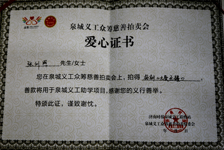 2014年8月24日,在美麗的泉城濟(jì)南錦云川大酒店,由濟(jì)南報(bào)業(yè)集團(tuán)、濟(jì)南時(shí)報(bào)泉城義工聯(lián)絡(luò)站、泉城義工慈善拍賣組委會(huì)主辦的“泉城義工慈善拍賣會(huì)”隆重召開,與會(huì)企業(yè)單位和人員三百余人,本次拍賣所得善款,將全數(shù)用于泉城義工助學(xué)項(xiàng)目基金。