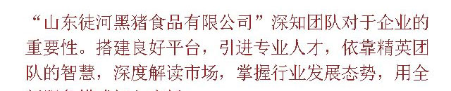 "山東徒河黑豬食品有限公司"深知團隊對企業(yè)的重要性。搭建良好平臺,引進專業(yè)人才,依靠經(jīng)營團隊的智慧,深度解讀市場,掌握行業(yè)發(fā)展態(tài)勢,用全新服務(wù)模式切入市場。