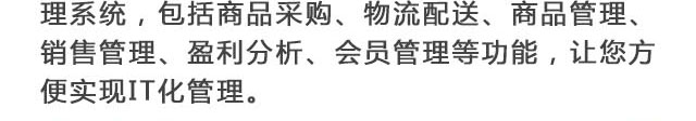 公司與國內(nèi)知名IT公司合作建立一套完善信息管理系統(tǒng),包括商品采購、物流配送、商品管理、銷售管理、盈利分析、會員管理等功能,讓您方便實現(xiàn)IT化管理。