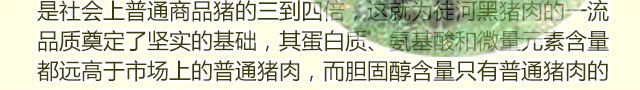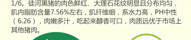 高于市場上的普通豬肉,而膽固醇含量只有普通豬肉的1/6。徒河黑豬的肉色